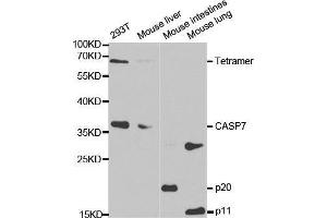 This gene encodes a member of the cysteine-aspartic acid protease (caspase) family. Sequential activation of caspases plays a central role in the execution-phase of cell apoptosis. Caspases exist as inactive proenzymes which undergo proteolytic processing at conserved aspartic residues to produce two subunits, large and small, that dimerize to form the active enzyme. The precursor of the encoded protein is cleaved by caspase 3 and 10, is activated upon cell death stimuli and induces apoptosis. Alternatively spliced transcript variants encoding multiple isoforms have been observed for this gene.,CASP7,CASP-7,CMH-1,ICE-LAP3,LICE2,MCH3,caspase-7,Casp7,Cancer,Invasion and Metastasis,Signal Transduction,ErbB-HER Signaling Pathway,Cell Biology & Developmental Biology,Apoptosis,Caspases,Inhibition of Apoptosis,Death Receptor Signaling Pathway,Endocrine & Metabolism,Neuroscience,Neurodegenerative Diseases,Casp7