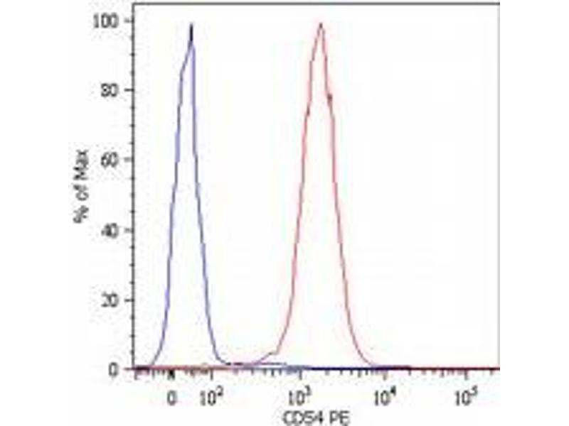 - CD54 (ICAM-1) is a 90 kD member of the C2 subset of immunoglobulin superfamily. It is a transmembrane molecule with 7 potential N-glycosylated sites, expressed on resting monocytes and endothelial cells and can be upregulated on many other cells, e.g. with lymphokines, on B- and T-lymphocytes, thymocytes, dendritic cells and also on keratinocytes, chondrocytes, as well as epithelial cells. CD54 mediates cell adhesion by binding to integrins CD11a/CD18 (LFA-1) and to CD11b/CD18 (Mac-1). The interaction of CD54 with LFA-1 enhances antigen-specific T-cell activation.Synonyms: ICAM-1, Intercellular adhesion molecule 1, Major Group Rhinovirus Receptor