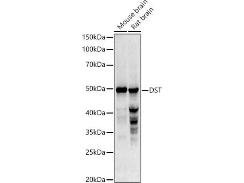 This gene encodes a member of the plakin protein family of adhesion junction plaque proteins. Multiple alternatively spliced transcript variants encoding distinct isoforms have been found for this gene, but the full-length nature of some variants has not been defined. It has been reported that some isoforms are expressed in neural and muscle tissue, anchoring neural intermediate filaments to the actin cytoskeleton, and some isoforms are expressed in epithelial tissue, anchoring keratin-containing intermediate filaments to hemidesmosomes. Consistent with the expression, mice defective for this gene show skin blistering and neurodegeneration.,DST,BP240,BPA,BPAG1,CATX-15,CATX15,D6S1101,DMH,DT,EBSB2,HSAN6,MACF2,dystonin,DST