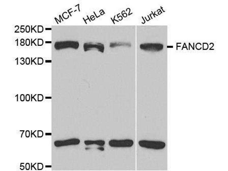 The Fanconi anemia complementation group (FANC) currently includes FANCA, FANCB, FANCC, FANCD1 (also called BRCA2), FANCD2, FANCE, FANCF, FANCG, FANCI, FANCJ (also called BRIP1), FANCL, FANCM and FANCN (also called PALB2). The previously defined group FANCH is the same as FANCA. Fanconi anemia is a genetically heterogeneous recessive disorder characterized by cytogenetic instability, hypersensitivity to DNA crosslinking agents, increased chromosomal breakage, and defective DNA repair. The members of the Fanconi anemia complementation group do not share sequence similarity, they are related by their assembly into a common nuclear protein complex. This gene encodes the protein for complementation group D2. This protein is monoubiquinated in response to DNA damage, resulting in its localization to nuclear foci with other proteins (BRCA1 AND BRCA2) involved in homology-directed DNA repair. Alternative splicing results in multiple transcript variants.,FA4,FAD,FACD,FAD2,FA-D2,FANCD,FANCD2,Epigenetics & Nuclear Signaling,DNA Damage & Repair,Cell Biology & Developmental Biology,Cell Cycle,G2/M DNA Damage Checkpoint,FANCD2