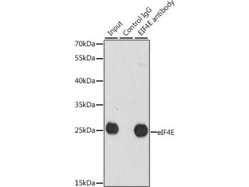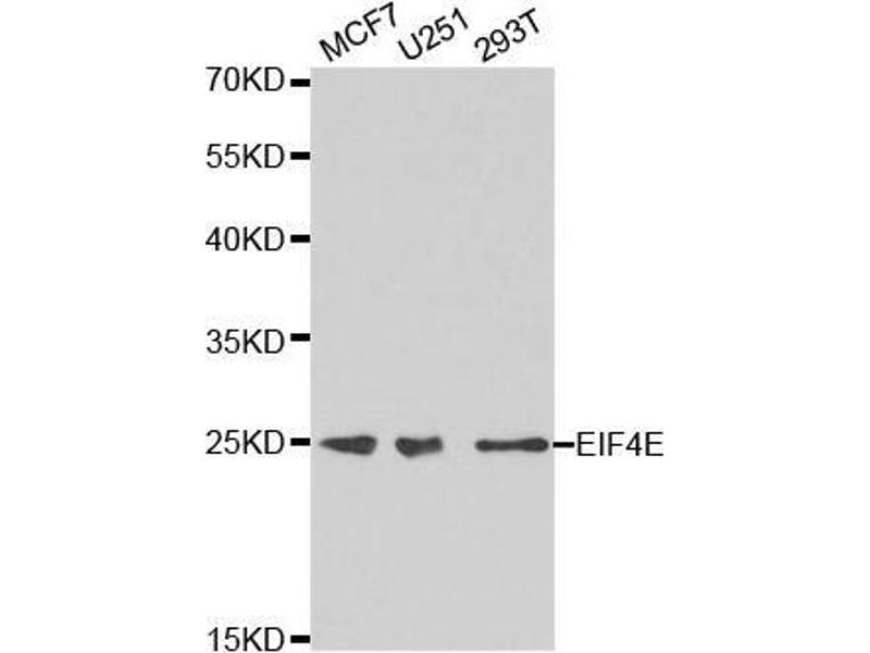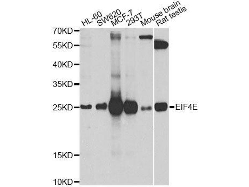The protein encoded by this gene is a component of the eukaryotic translation initiation factor 4F complex, which recognizes the 7-methylguanosine cap structure at the 5' end of messenger RNAs. The encoded protein aids in translation initiation by recruiting ribosomes to the 5'-cap structure. Association of this protein with the 4F complex is the rate-limiting step in translation initiation. This gene acts as a proto-oncogene, and its expression and activation is associated with transformation and tumorigenesis. Several pseudogenes of this gene are found on other chromosomes. Alternative splicing results in multiple transcript variants.,AUTS19,CBP,EIF4E1,EIF4EL1,EIF4F,eIF-4E,EIF4E,Epigenetics & Nuclear Signaling,Translation Control,Regulation of eIF4 and p70 S6 Kinase,Signal Transduction,Endocrine & Metabolism,Insulin Receptor Signaling Pathway,Immunology & Inflammation,Cardiovascular,Angiogenesis,EIF4E