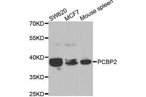 The protein encoded by this gene appears to be multifunctional. Along with PCBP-1 and hnRNPK, it is one of the major cellular poly(rC)-binding proteins. The encoded protein contains three K-homologous (KH) domains which may be involved in RNA binding. Together with PCBP-1, this protein also functions as a translational coactivator of poliovirus RNA via a sequence-specific interaction with stem-loop IV of the IRES, promoting poliovirus RNA replication by binding to its 5'-terminal cloverleaf structure. It has also been implicated in translational control of the 15-lipoxygenase mRNA, human papillomavirus type 16 L2 mRNA, and hepatitis A virus RNA. The encoded protein is also suggested to play a part in formation of a sequence-specific alpha-globin mRNP complex which is associated with alpha-globin mRNA stability. This multiexon structural mRNA is thought to be retrotransposed to generate PCBP-1, an intronless gene with functions similar to that of PCBP2. This gene and PCBP-1 have paralogous genes (PCBP3 and PCBP4) which are thought to have arisen as a result of duplication events of entire genes. Thsi gene also has two processed pseudogenes (PCBP2P1 and PCBP2P2). Multiple transcript variants encoding different isoforms have been found for this gene.,PCBP2,HNRNPE2,HNRPE2,hnRNP-E2,Epigenetics & Nuclear Signaling,RNA Binding,PCBP2