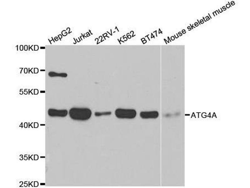 Autophagy is the process by which endogenous proteins and damaged organelles are destroyed intracellularly. Autophagy is postulated to be essential for cell homeostasis and cell remodeling during differentiation, metamorphosis, non-apoptotic cell death, and aging. Reduced levels of autophagy have been described in some malignant tumors, and a role for autophagy in controlling the unregulated cell growth linked to cancer has been proposed. This gene encodes a member of the autophagin protein family. The encoded protein is also designated as a member of the C-54 family of cysteine proteases.,ATG4A,APG4A,AUTL2,Cancer,Invasion and Metastasis,Signal Transduction,Cell Biology & Developmental Biology,Autophagy,Extracellular Matrix,Ubiquitin,Endocrine & Metabolism,Mitochondrial metabolism,Cardiovascular,Heart,ATGs,ATG4A