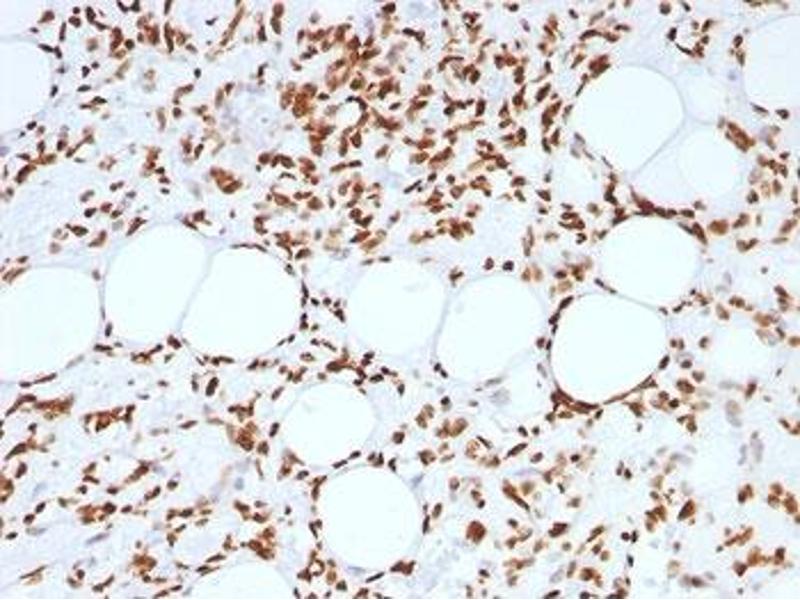 2. The prediluted format is supplied in a dropper bottle and is optimized for use in IHC. After epitope retrieval step (if required), drip mAb solution onto the tissue section and incubate at RT for 30 min.\. Western blot: 0.5-1 μg/mL, Flow Cytometry: 0.5-1 μg/million cells in 0.1ml,Immunofluorescence: 0.5-1 μg/mL,Immunohistochemistry (FFPE): 0.5-1 μg/mL for 30 min at RT (1),Prediluted format : incubate for 30 min at RT (2) -