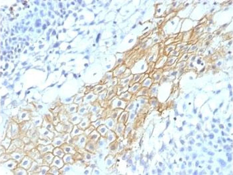 1. Staining of formalin-fixed tissues requires boiling tissue sections in 10 mM Citrate buffer, pH 6.0, for 10-20 min followed by cooling at RT for 20 min.