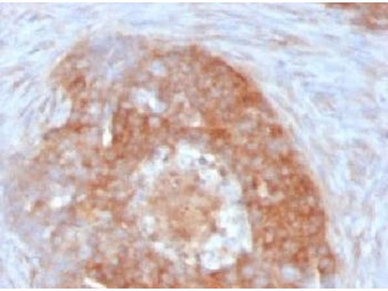 - Recognizes a protein of 55 kDa, which is identified as fascin-1. Its actin binding ability is regulated by phosphorylation. Antibody to fascin-1 is a very sensitive marker for Reed-Sternberg cells and variants in nodular sclerosis, mixed cellularity, and lymphocyte depletion Hodgkin's disease. It is uniformly negative in lymphoid cells, plasma cells, and myeloid cells. Fascin-1 is also expressed in dendritic cells. This marker may be helpful to distinguish between Hodgkin lymphoma and non-Hodgkin lymphoma in difficult cases. Also, the lack of expression of fascin-1 in the neoplastic follicles in follicular lymphoma may be helpful in distinguishing these lymphomas from reactive follicular hyperplasia in which the number of follicular dendritic cells is normal or increased. Antibody to fascin-1 has been suggested as a prognostic marker in neuroendocrine neoplasms of the lung as well as in ovarian cancer. Fascin-1 expression may be induced by Epstein-Barr virus (EBV) infection of B cells with the possibility that viral induction of fascin in lymphoid or other cell types must also be considered in EBV-positive cases.