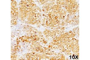1. Staining of formalin-fixed tissues is enhanced by boiling tissue sections in 10 mM Citrate Buffer, pH 6.0, for 10-20 min followed by cooling at RT for 20 minutes.