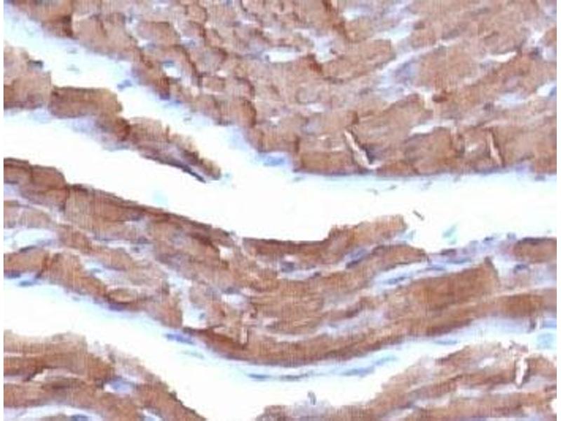 This antibody recognizes actin of skeletal, cardiac, and smooth muscle cells. It is not reactive with other mesenchymal cells except for myoepithelium. Actin can be resolved on the basis of its isoelectric points into three distinctive components: alpha, beta, and gamma in order of increasing isoelectric point. Anti-muscle specific actin recognizes alpha and gamma isotypes of all muscle groups. Non-muscle cells such as vascular endothelial cells and connective tissues are non-reactive. Also, neoplastic cells of non-muscle-derived tissue such as carcinomas, melanomas, and lymphomas are negative. It stains tumors of smooth muscle (leiomyomas and leiomyosarcomas) as well as skeletal muscle (rhabdomyomas and rhabdomyosarcomas).