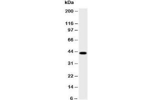 The stated application concentrations are suggested starting amounts. Titration of the HSD17B2 antibody may be required due to differences in protocols and secondary/substrate sensitivity.\. Western blot: 0.5-1 μg/mL,IHC (Paraffin): 0.5-1 μg/mL,IHC (Frozen): 0.5-1 μg/mL
