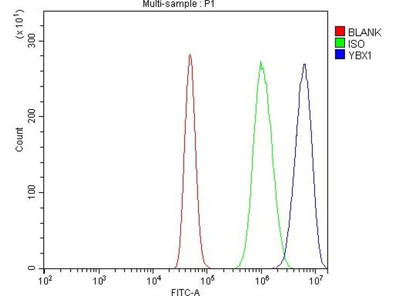 Background: YBX1 (Y box binding protein 1), commonly referred to as "YB-1" by researchers, is a human protein. YB1 binding has an absolute requirement for the CCAAT box and relative specificity for the Y box. It has a molecular mass of 35,414 and contains 18 % basic residues and putative nuclear localization signals. The YBX1 gene is mapped on 1p34.2. Ybx1 was highly expressed in mouse erythroid myeloid lymphoid clone-1 (EML), a hematopoietic precursor cell line, but that it was downregulated in myeloid progenitors and in Gmcsf-treated EML cells during myeloid differentiation. Ybx1 was expressed at high levels in myeloid leukemic cells at different developmental stages. Knockdown of YBX1 in a human leukemic cell line inhibited proliferation ability, induced apoptosis, and induced megakaryocytic differentiation in response to arsenic trioxide treatment. YBX1 is downregulated during myeloid differentiation and aberrant YBX1 expression in leukemic cells may contribute to leukemia development by blocking differentiation.