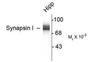 - Specific for the ~78k synapsin I doublet in Western blots of rat brain extracts. Immunolabeling blocked by preadsorption of antibody with the protein used to generate the antibody