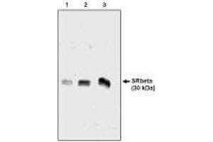 - Detects SRbeta by Western blot analysis at 15 μg/mL. Antibody will not detect SRbeta protein bound to SRalpha. Optimal concentration should be evaluated by serial dilutions.