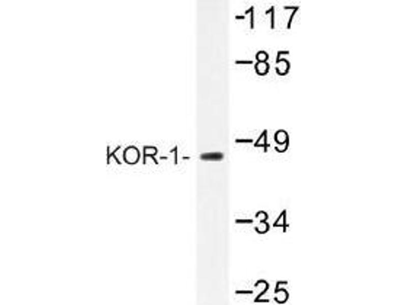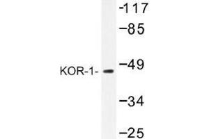 Opioid is the term used to designate a group of compounds that are opium-like in their properties. These drugs have effects on perception of pain, consciousness, motor control, mood, and autonomic function, and can induce physical dependence. Pharmacological studies suggested that there are at least 3 major classes of opioid receptors, designated delta, kappa, and mu. They differ in their affinity for various opioid ligands and in their cellular distribution. Studies of the receptors in the mouse and rat show that they are structurally related and are members of the family of 7 transmembrane-spanning G protein-coupled receptors. The kappa opiod receptor inhibits neurotransmitter release by reducing calcium ion currents and increasing potassium ion conductance. It is the receptor for beta-endorphin.Synonyms: KOR-1, KOR1, OPRK, OPRK1
