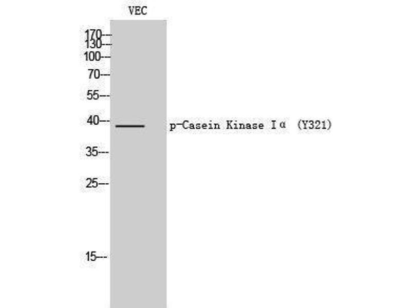 Phospho-Casein Kinase Iα (Y321) Polyclonal Antibody detects endogenous levels of Casein Kinase Iα protein only when phosphorylated at Y321.