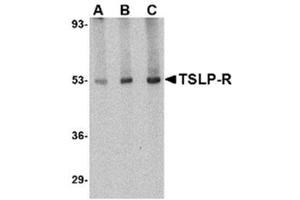 Antisera to human TSLP receptor were raised by repeated immunisation of rabbits with highly purified antigen. Purified IgG was prepared by affinity chromatography.