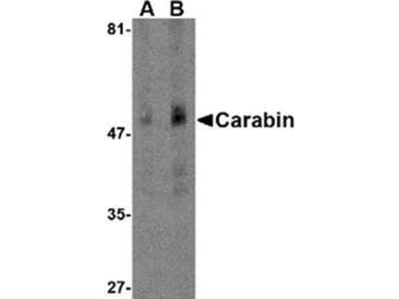 This antibody recognises Carabin, also known as TBC1 domain family member 10C (TBC1D10C), a 50 kDa protein belonging to the TBC1 domain family of proteins. This antibody does not cross react with either TBC1D10A or TBC1D10B.
