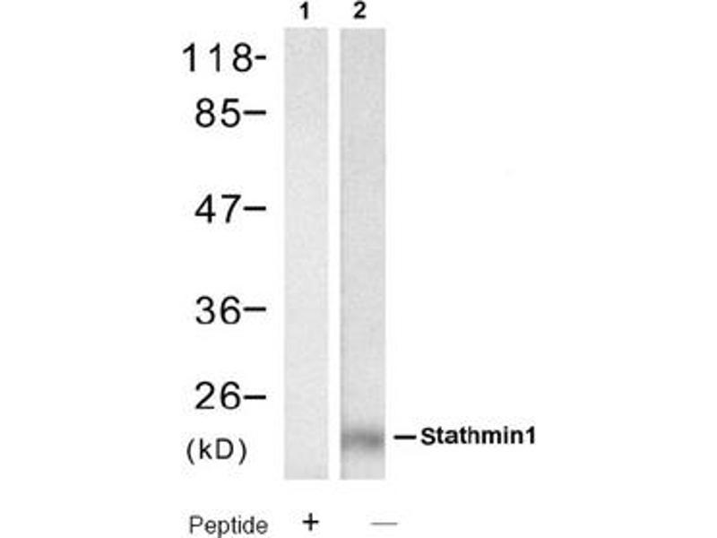 The antiserum was produced against synthesized non-phosphopeptide derived from human Stathmin-1 around the phosphorylation site of Serine 62 (R-K-Sp-H-E).