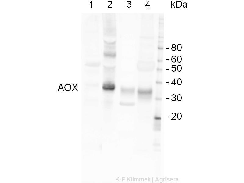 KLH-conjugated synthetic peptide derived from fully conserved C-terminal consensus motif from plant AOX isoforms 1 and 2 including Arabidopsis thaliana AOX1A (At3g22370) and AOX2 (At3g64210), Solanum lycopersicum Q7XBG9, Oryza sativa Q7XT33,