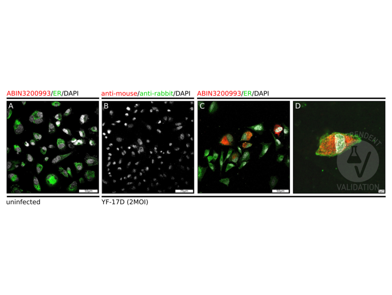 1205Lu melanoma cells infected (B, C, D) and uninfected (A) with yellow fever vaccine strain YF-17D were stained with anti-Flavivirus E protein antibody ABIN3200993 and an ER-specific antibody (A, C, D) and AF647- (red) and AF488-conjugated (green) secondary antibodies or only with the secondary antibodies (B). DAPI counterstain (white) was used to reveal cells.