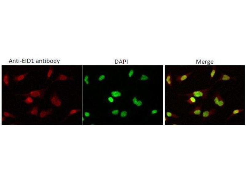 EID1 (EP300 interacting inhibitor of differentiation 1) encodes a 21 kDa protein, which interacts with RB1 and EP300 and acts as a repressor of MYOD1 transcription. EID1 inhibits EP300 and CBP histone acetyltransferase activity. It may be involved in coupling cell cycle exit to the transcription of genes required for cellular differentiation.