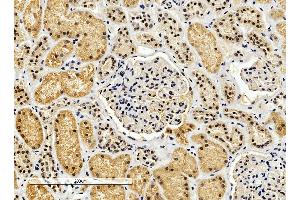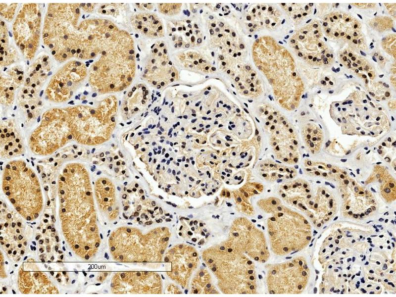 Immunohistochemistry: In paraffin embedded Human Kidney shows cytoplasm staining preferentially in PC. Recommended concentration, 2-4 μg/mL.
