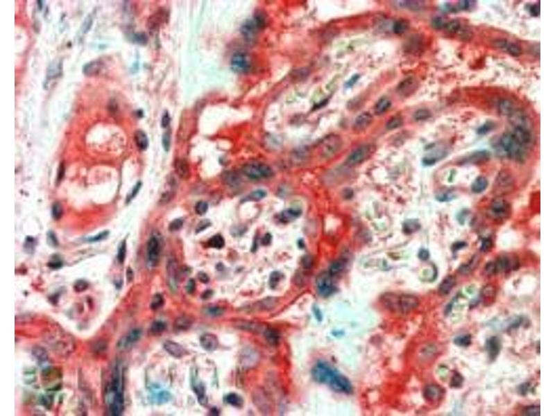 Immunohistochemistry: In paraffin embedded Human Placenta shows cytoplasm staining of trophoblasts. Recommended concentration, 2-3 μg/mL.