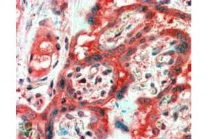 Immunohistochemistry: In paraffin embedded Human Placenta shows cytoplasm staining of trophoblasts. Recommended concentration, 2-3 μg/mL.