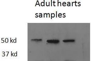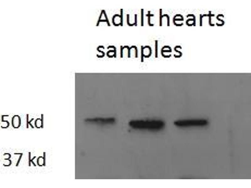 Western Blot: Approx 50 kDa band observed in Zebrafish adult Heart lysates (calculated MW of 44.3 kDa according to NP_571415.1). Recommended concentration: 2-5 μg/mL.