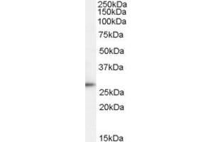 Western Blot: Approx 26-28 kDa band observed in Human Lymph Node and Human Kidney lysates (calculated MW of 24.3 kDa according to NP_001020423.1). The observed molecular weight corresponds to earlier findings in literature with different antibodies (Tiacc