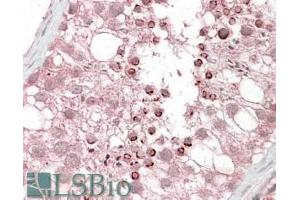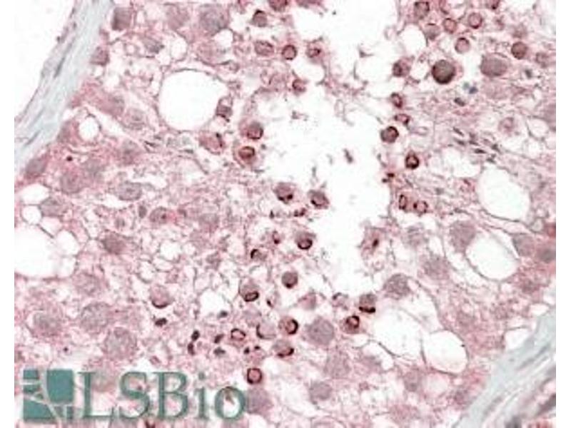 Immunohistochemistry: In paraffin embedded Human Testis shows acrosomal staining in spermatids. Recommended concentration, 2.5-3.8 μg/mL.