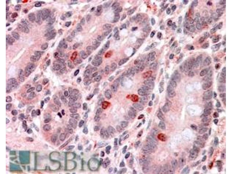 Immunohistochemistry: In paraffin embedded Human Small Intestine shows staining of endocrine cells amongst the enterocytes. Recommended concentration: 3-6 μg/mL.