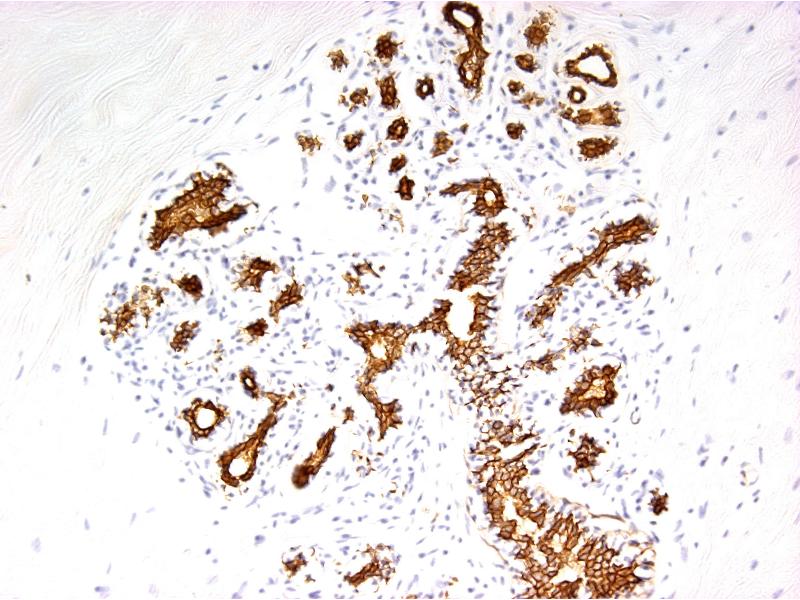 RCK105 reacts exclusively with cytokeratin 7 which is present in a subgroup of glandular epithelia and their tumors, as well as transitional epithelium and transitional carcinoma. RCK105 is suitable for immunoblotting, immunocytochemistry, immunohistochemistry on frozen sections and flow cytometry. Optimal antibody dilution should be determined by titration, recommended range is 1:100 - 1:200 for flow cytometry, and for immunohistochemistry with avidin-biotinylated horseradish peroxidase complex (ABC) as detection reagent, and 1:100 - 1:1000 for immunoblotting applications.