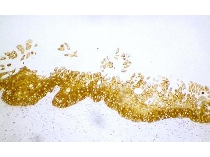 Cytokeratins are a subfamily of intermediate filament proteins and are characterized by a remarkable biochemical diversity, represented in human epithelial tissues by at least 20 different polypeptides. They range in molecular weight between 40 kDa and 68 kDa and isoelectric pH between 4.9 - 7.8. The individual human cytokeratins are numbered 1 to 20. The various epithelia in the human body usually express cytokeratins which are not only characteristic of the type of epithelium, but also related to the degree of maturation or differentiation within an epithelium. Cytokeratin subtype expression patterns are used to an increasing extent in the distinction of different types of epithelial malignancies. The cytokeratin antibodies are not only of assistance in the differential diagnosis of tumors using immunohistochemistry on tissue sections, but are also a useful tool in cytopathology and flow cytometric assays.