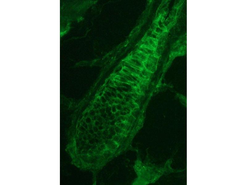 Plakophilin-3 is an Armadillo-like protein present in nuclei and desmosomes of epithelial cells [1]. The expression pattern of this protein seems to be largely restricted to epithelial cell types. Plakophilin-3 can be detected along cell borders in a punctuate staining pattern typical for desmosomal proteins. In addition to the desmosomal immunolocalisation, immunostaining was observed as bright nuclear speckles. Thus, like plakophilin-1 and-2, plakophilin-3 displays a dual intracellular localisation in the desmosomal plaque and in the cell nucleus, and therefore is probably involved in signal transduction pathways between the plasma membrane and the nucleus. The human protein has a predicted molecular mass of 87 kD.