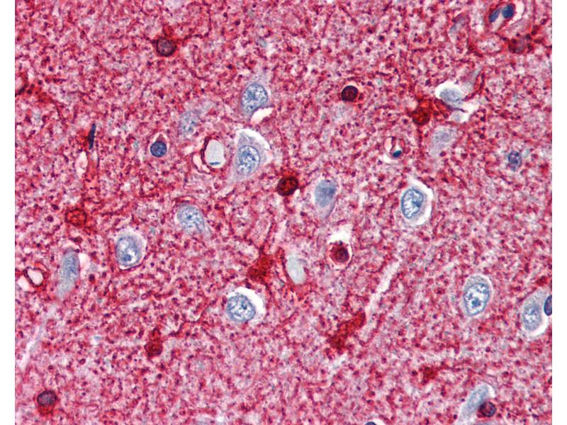 Usage: Immunohistochemistry: This antibody was validated for use in immunohistochemistry on a panel of 21 formalin-fixed, paraffin-embedded (FFPE) human tissues after heat induced antigen retrieval in pH 6.0 citrate buffer. After incubation with the primary antibody, slides were incubated with biotinylated secondary antibody, followed by alkaline phosphatase-streptavidin and chromogen. The stained slides were evaluated by a pathologist to confirm staining specificity. The optimal working concentration for this antibody was determined to be 10 μg/mL. Western Blot: 1:500. Single band in sheep and rat brain. Positive control: Rat brain tissue, rat brain cytosolic fraction, human brain lysate. -