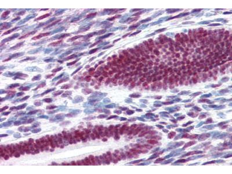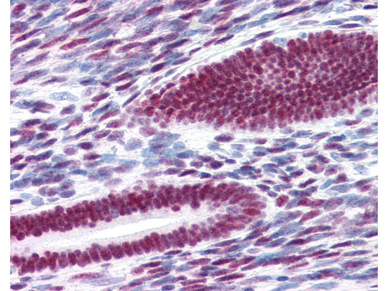 Usage: Immunohistochemistry: This antibody was validated for use in immunohistochemistry on a panel of 21 formalin-fixed, paraffin-embedded (FFPE) human tissues after heat induced antigen retrieval in pH 6.0 citrate buffer. After incubation with the primary antibody, slides were incubated with biotinylated secondary antibody, followed by alkaline phosphatase-streptavidin and chromogen. The stained slides were evaluated by a pathologist to confirm staining specificity. The optimal working concentration for this antibody was determined to be 10 μg/mL. -