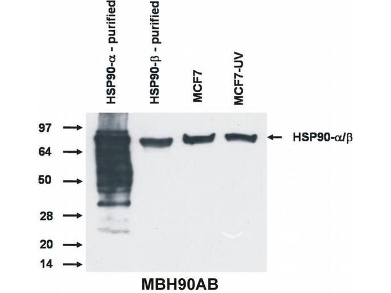 - The antibody MBH90AB recognizes the epitope EEEVE within N-terminal part of ubiquitously expressed Hsp90 alpha and Hsp90 beta intracellular proteins with calculated Mw of 84.7 kDa and 83.3 kDa, respectively, however, migrating as 90 kDa bands under reducing SDS-PAGE conditions.