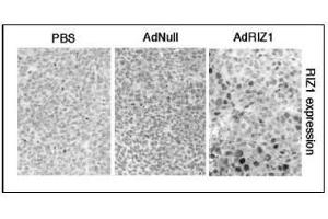 PRDM2 is a 250-kD nuclear protein containing 8 zinc finger motifs. It contains an RB-binding motif that is related to that of the adenovirus E1A oncoprotein, RIZ also shares an antigenic epitope with the C terminus of E1A. It is expressed in human retinoblastoma cells and at low levels in all other human cell lines examined. Using fluorescence in situ hybridization, the PRDM2 gene has been mapped to 1p36. PRDM2 may be a candidate target of 1p36 alterations that commonly occur in neuroendocrine, breast, liver, colon, skin, and lymphoid tumors.Synonyms: GATA-3-binding protein G3B, HUMHOXY1, KMT8, Lysine N-methyltransferase 8, MTB-ZF, MTE-binding protein, PR domain zinc finger protein 2, RIZ1, RIZ2, Retinoblastoma protein-interacting zinc finger protein