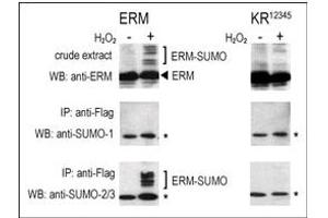 Covalent modification of target lysines by SUMO (small ubiquitin-like modifier) modulates processes such as protein localization, transcription, nuclear transport, mitosis, DNA replication and repair, signal transduction, and viral reproduction. SUMO does not seem to be involved in protein degradation and may in fact function as an antagonist of ubiquitin in the degradation process. The SUMO family consists of SUMO1 and closely related homologs SUMO2, SUMO3, and SUMO4. Sumoylation has been shown to regulate a wide range of proteins, including MDM2, PIAS, PML, RanGAP1, RanBP2, p53, p73, HIPK2, TEL, c-Jun, Fas, Daxx, TNFRI, Topo-I, Topo-II, PARK2, WRN, Sp100, IkB-alpha, Androgen receptor (AR), GLUT1/4, CaMK, DNMT3B, TDG, HIF1A, CHD3, EXOSC9, RAD51, and viral targets such as CMV-IE1/2, EBV-BZLF1, and HPV/BPV-E1.Synonyms: GAP-modifying protein 1, GMP1, SMT3 homolog 3, SMT3C, SMT3H3, Sentrin, Small ubiquitin-related modifier 1, UBL1, Ubiquitin-homology domain protein PIC1, Ubiquitin-like protein SMT3C, Ubiquitin-like protein UBL1