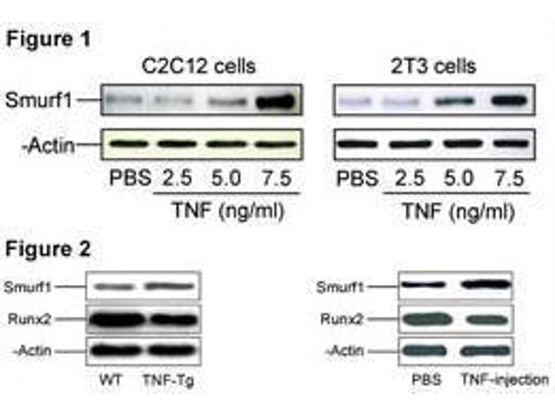 Members of the transforming growth factor-beta (TGFB) family signal through type I and type II serine/threonine-kinase receptors, which in turn activate the SMAD signaling pathway. Bone morphogenetic protein (BMP) receptors target SMAD1, SMAD5, and SMAD8, whereas receptors for activin and TGFB (e.g., ACVR1 and TGFBR1, respectively) target SMAD2 and SMAD3. Phosphorylation of these receptor-regulated SMADs induces their association with the common-partner SMAD, SMAD4. Smurf1, a HECT domain E3 ubiquitin ligase, regulates cell polarity and protrusive activity and is required to maintain the transformed morphology and motility of a tumor cell. Atypical protein kinase C-zeta (PKC2), an effector of the Cdc42/Rac1-PAR6 polarity complex, recruits Smurf1 to cellular protrusions, where it controlled the local level of RhoA. Smurf1 thus links the polarity complex to degradation of RhoA in lamellipodia and filopodia to prevent RhoA signaling during dynamic membrane movements.Synonyms: E3 ubiquitin-protein ligase SMURF1, KIAA1625, SMAD ubiquitination regulatory factor 1, SMAD-specific E3 ubiquitin-protein ligase 1, SMURF 1, SMURF-1