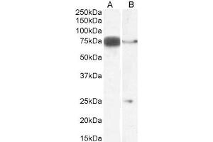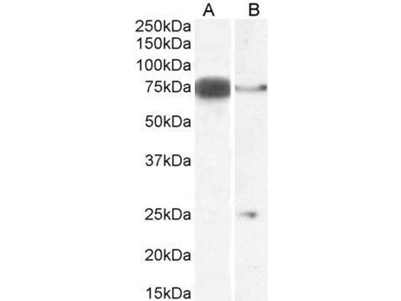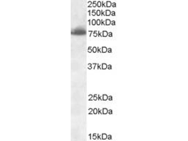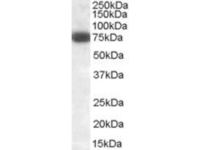 Western Blot: Approx 75 kDa band observed in Mouse Heart and Rat Pancreas lysates (calculated MW of 78.5 kDa according to Mouse NP_031891.2 and 77.4 kDa according to Rat NP_114452.1). An additional band of unknown identity was also consistently observed at
