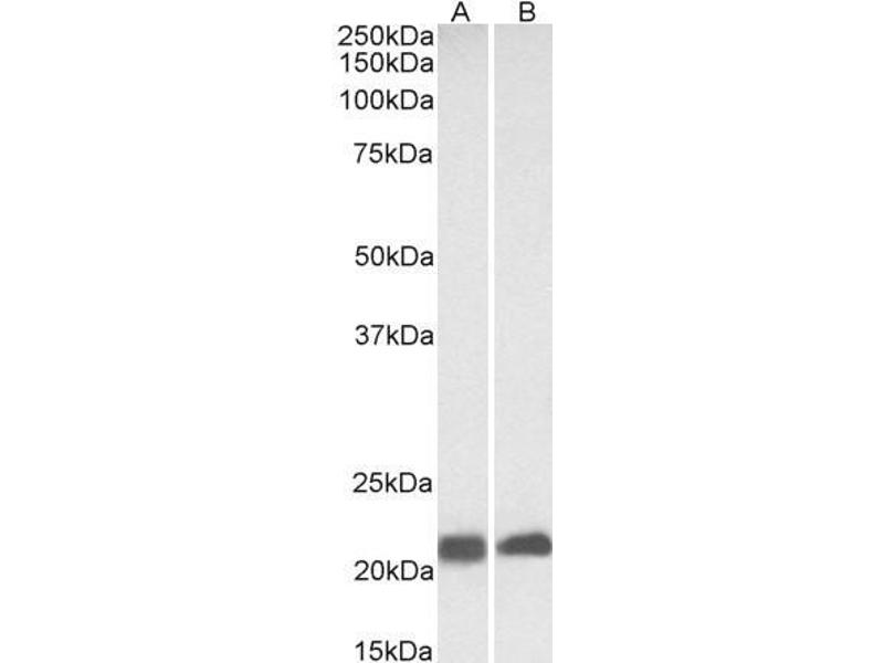 Western Blot: Approx 23 kDa band observed in Human, Mouse and Rat Heart lysates and approx. 20 kDa in Pig Heart and Skeletal Muscle lysates (calculated MW of 17.3 kDa according to Human NP_203123.1,17.4 kDa according to Mouse NP_031643.1, Rat NP_062028.1 and