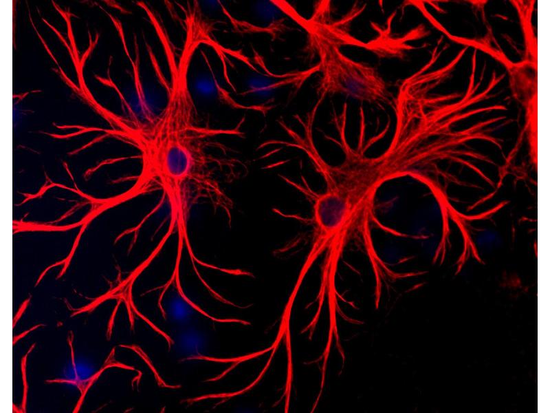 Glial Fibrillary Acidic Protein (GFAP) was discovered by Amico Bignami and co-workers as a major fibrous protein of multiple sclerosis plaques (1). It was subsequently found to be a member of the 10nm or intermediate filament (IF) family, specifically the IF family Class III, which also includes peripherin, desmin and vimentin. GFAP is strongly and specifically expressed in astrocytes and certain other astroglia in the CNS, in satellite cells, peripheral ganglia, and in non-myelinating Schwann cells in peripheral nerves. In many damage and disease states GFAP expression is heavily upregulated in astrocytes. In addition, neural stem cells frequently strongly express GFAP. Point mutations in the protein coding region of the GFAP gene lead to Alexander disease which is characterized by the presence of abnormal astrocytes containing GFAP protein aggregates known as Rosenthal fibers (2). Anti-GFAP Left: Western blot of rat cortex lysate showing specific immunolabeling of the ~ 50k GFAP protein. Right: Mixed cultures of neurons and glia stained with chicken anti-GFAP (red), and DNA (blue). Astrocytes stain strongly and specifically in a clearly filamentous fashion with this antibody.