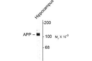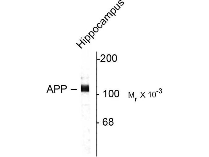 - Specific for endogenous levels of the ~115 kDa APP protein. Immunolabeling of the APP protein band is completely blocked by preadsorption of the antibody with the peptide used as antigen.