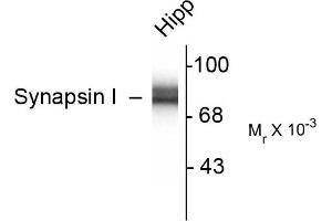 - Specific for endogenous levels of the ~78 kDa synapsin I doublet. Immunolabeling blocked by preadsorption of antibody with the protein used to generate the antibody.