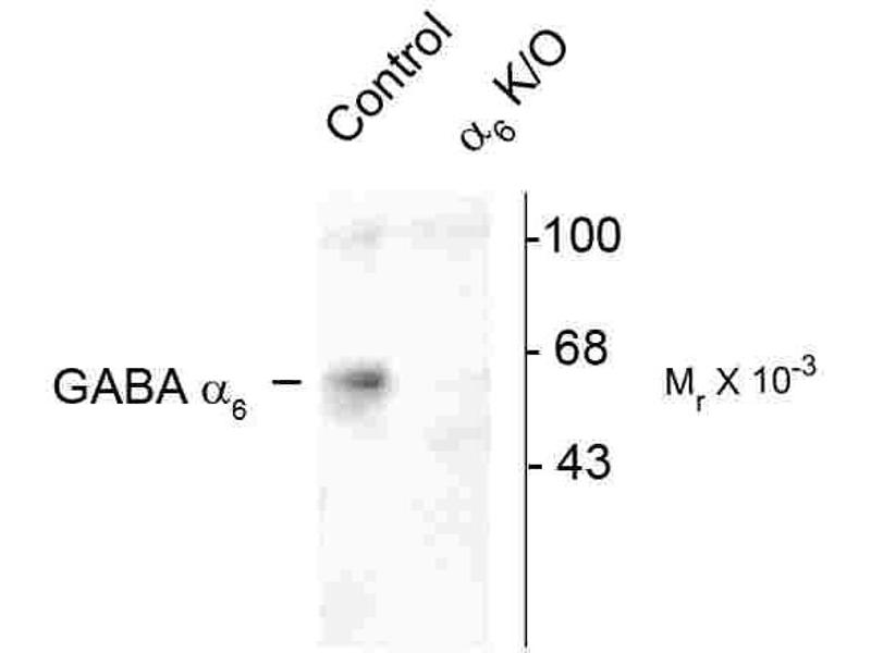 - Specific for endogenous levels of the ~57 kDa α6-subunit of the GABAA receptor. Labeling is absent in α6-subunit knockout animals.