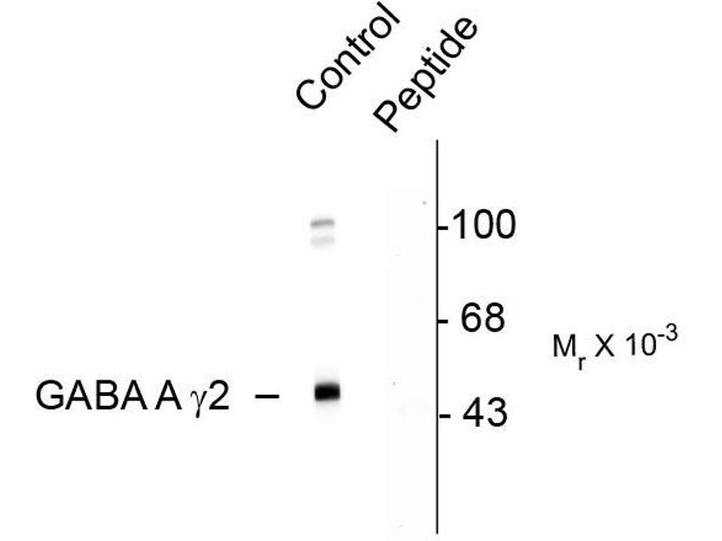 - Specific for endogenous levels of the ~45 kDa GABAA receptor γ2 subunit phosphorylated at Ser327. Immunolabeling is blocked by preadsorption with the phosphopeptide used as antigen, but not by the corresponding non-phosphopeptide.