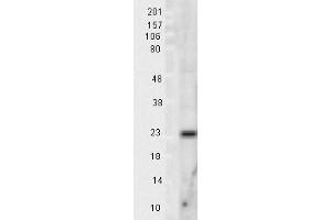 0.5 μg/ml of ABIN361655 was sufficient for detection of Mn SOD in 20 μg of rat brain tissue extract by colorimetric immunoblot analysis using Goat anti-rabbit IgG:AP as the secondary antibody.