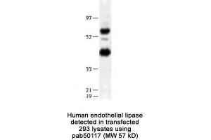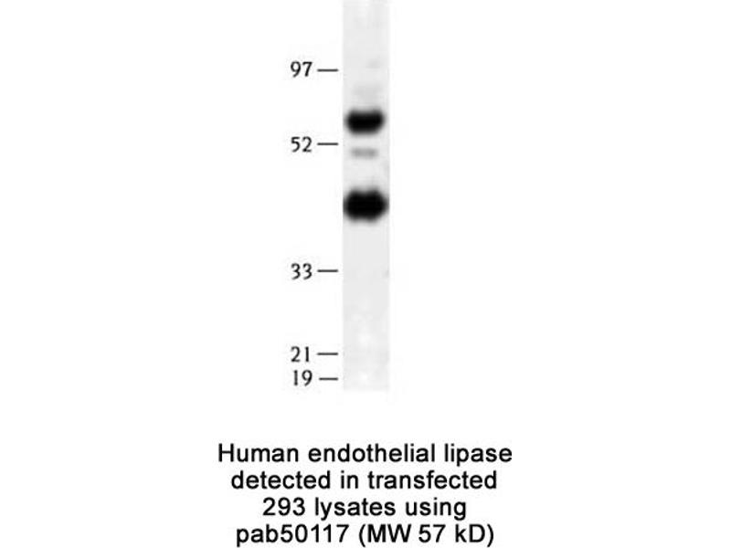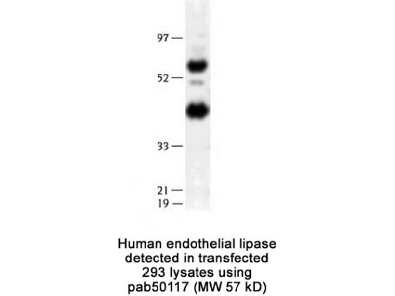 - Reacts with human ~57 kDa (mature, non-glycosylated form) and ~ 45 kDa (proteolytic form) of LIPG protein