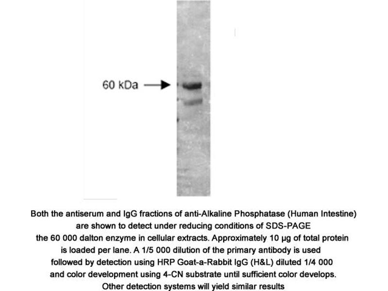 Purified antibody reacts with alkaline phosphatase from human intestine showing a 60 kDa band against this enzyme under reducing conditions of SDS-PAGE Elevated expression of this enzyme is associated with undifferentiated pluripoten stem cell (PSC).